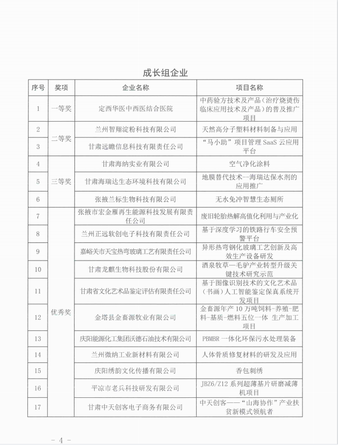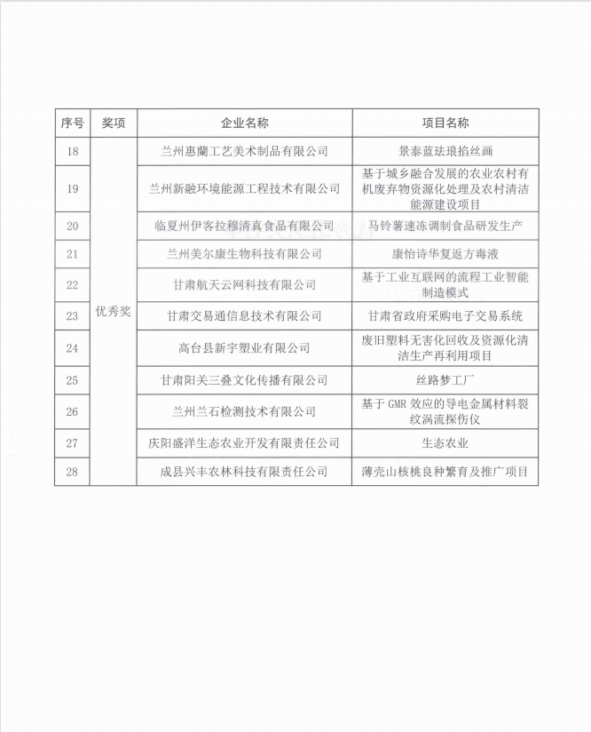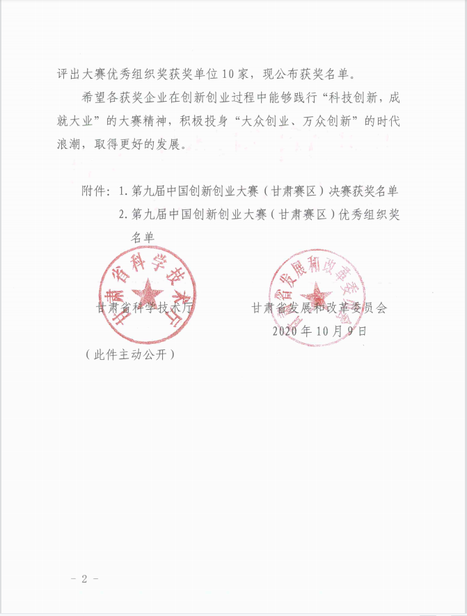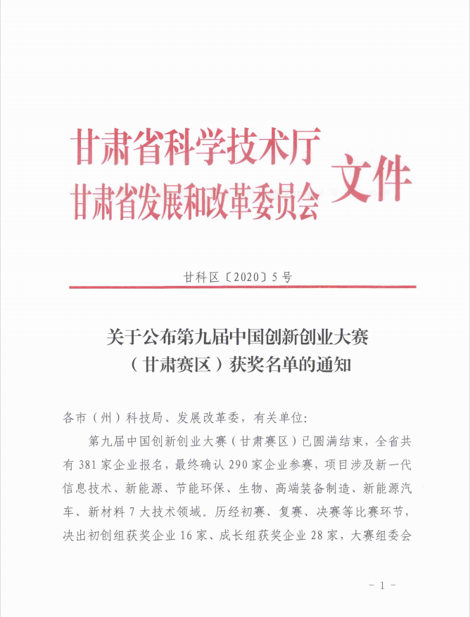第九屆中國創新創業大賽(甘肅賽區)獲獎名單的通知