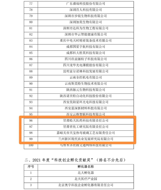 據介紹,此次評選獲得2021年度“科技創業孵化貢獻獎”的甘肅企業單位有:甘肅鼎譽創業孵化園、蘭州大學國家大學科技園、蘭州高新創業置業投資有限責任公司、蘭州新區產業孵化大廈(蘭州新區科文旅集團科創公司);獲得2021年度“科學創新貢獻獎”的甘肅企業單位有甘肅皓天醫藥科技有限責任公司、甘肅省化工研究院有限責任公司、嘉峪關市天寶熱彎玻璃工藝有限責任公司和蘭州新區現代農業發展研究院有限公司,